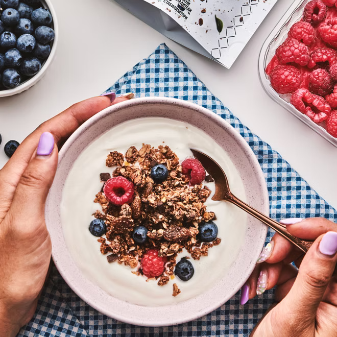 Изсипете съдържанието в купа. Гарнирайте част от продукта с кисело мляко, скир, ядково мляко, сушени или пресни плодове.
