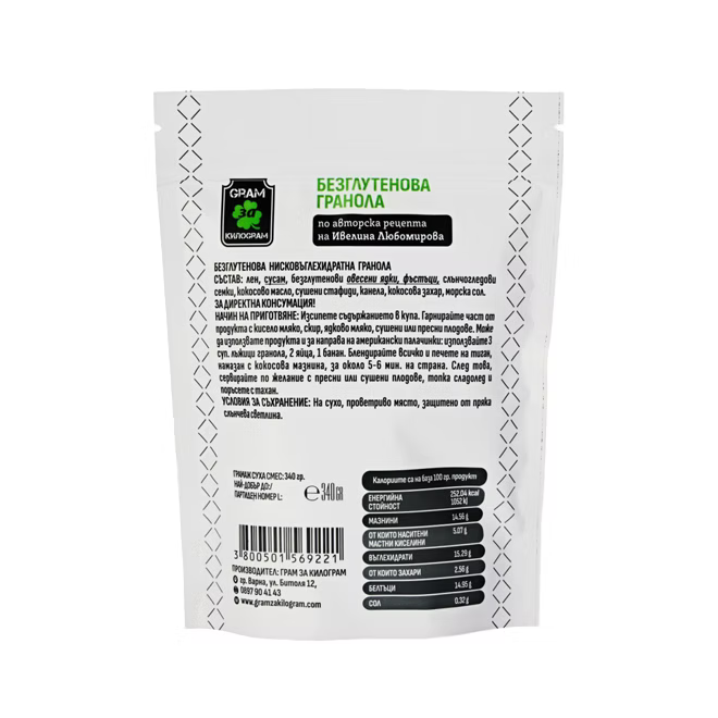 Съставки: лен, сусам, безглутенови овесени ядки, фъстъци, слънчогледови семки, кокосово масло, сушени стафиди, канела, кокосова захар, морска сол.