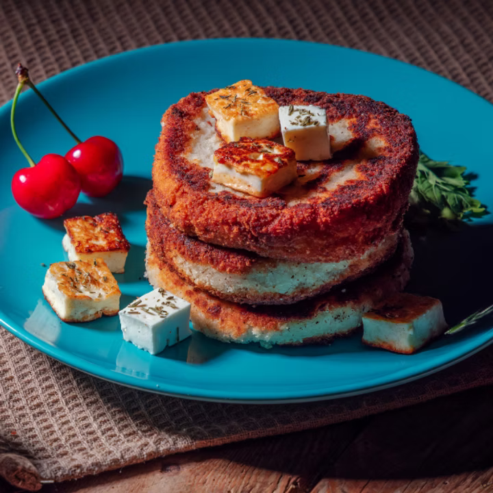 Добавете едно предварително разбито яйце и след него 280 мл вода на стайна температура. С намокрени ръце размесете тестото и оставете за 15 мин. Оформете като руло и нарежете на равни части с дебелина 1.5 см. Загрейте мазнина в тигана и поставете отрязаните парчета.