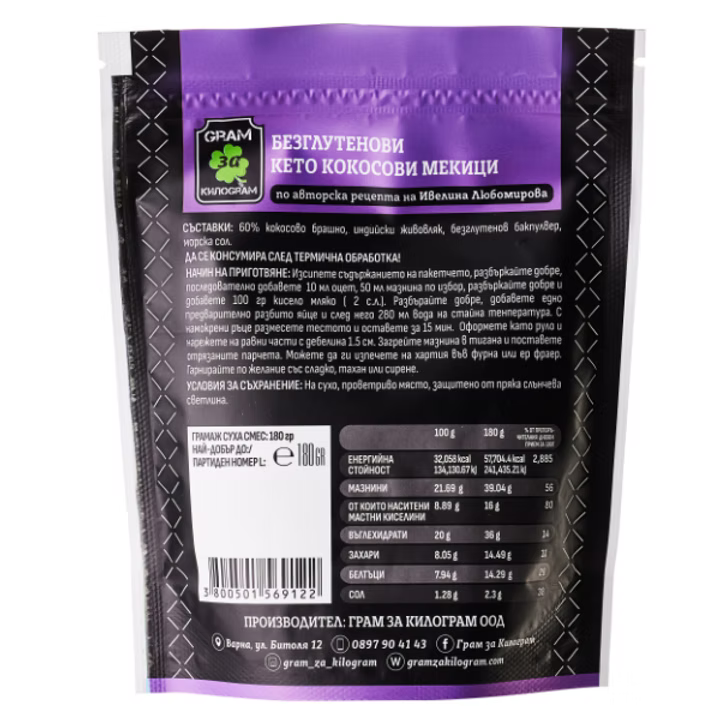 Съставки: 60% кокосово брашно, индийски живовляк, безглутенов бакпулвер, морска сол.