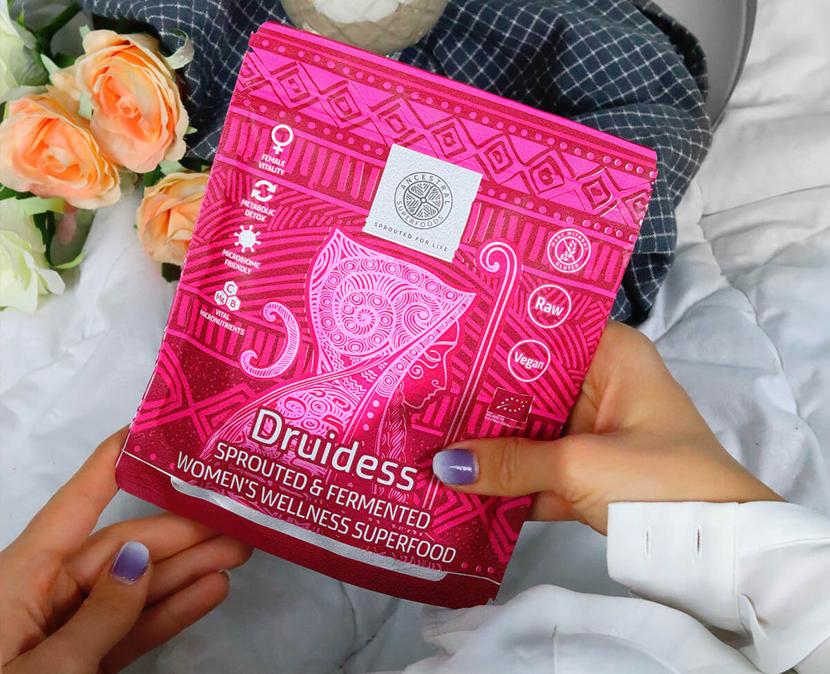Druidess е покълнала и ферментирала функционална храна за женско здраве и вътрешен баланс, която подкрепя хормоналния и метаболитния баланс, помага при ПМС, кожни проблеми и нарушено храносмилане.Състав:покълнало и ферментирало златно просо на прах*, покълнал кафяв ориз на прах*, покълнало златно ленено семе на прах*, покълнала елда на прах*, сушени плодове на прах*: (ябълка, шипка, арония, червена боровинка и синя боровинка), коприва на прах*, натурален аромат на лимон, натурален аромат на синя боровинка, пробиотичен комплекс* (Lactobacillus gasseri, Lactobacillus acidophilus, Lactobacillus casei sp. rhamnosus, Bifidobacterium bifidum, Bifidobacterium infantis, Bifidobacterium longum, Bifidobacterium breve, Bifidobacterium adolescentis, Streptococcus thermophilus), деактивирана хранителна мая**от биологично земеделие
