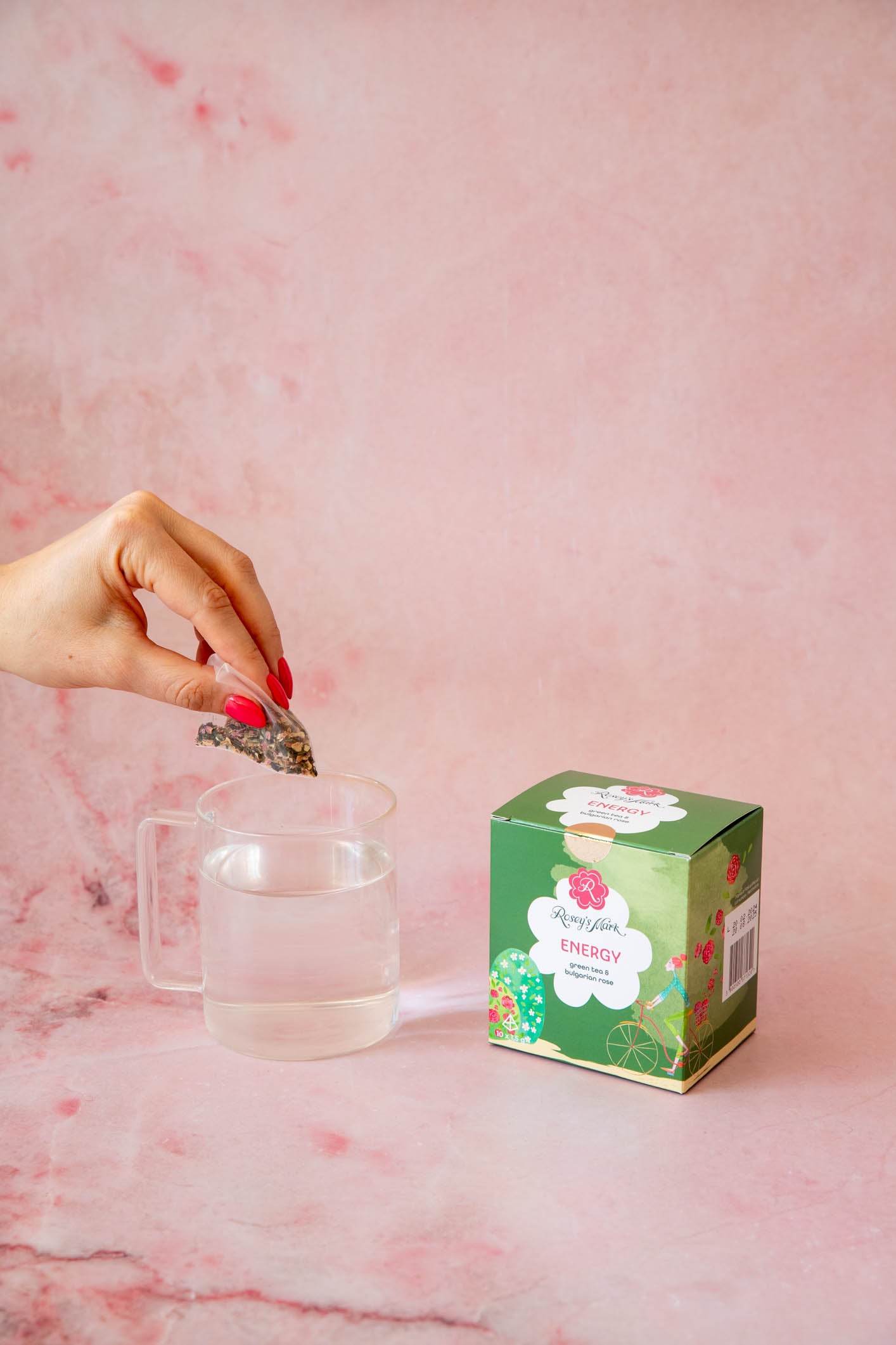 Чай на пакетчета тип пирамидка, комбиниращ зелен чай сенча и българска роза дамасцена. Кутия с 10 бр. индивидуално опаковани чаени пирамидки от биоразградим кристален материал.