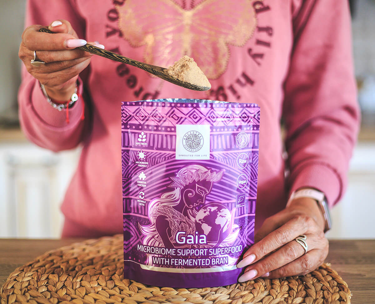 Gaia е нежна и ефективна покълнала и ферментирала функционална храна на прах с високо съдържание на фибри, ферментирали съставки и фитонутриенти, специално създадена за поддържане на здравето на червата, намаляване на подуването на стомаха и подкрепа на имунната система.Съставки:смес от ферментирали трици на прах*: (кафяв лен и кафяв ориз), инулин*, ябълка на прах*, покълнало и ферментирано златно просо на прах*, арония на прах*, шипка на прах* *от биологично земеделие