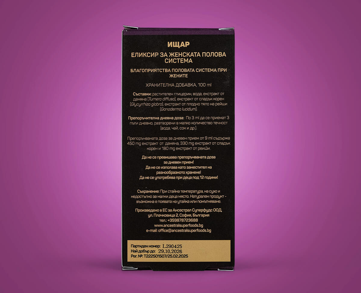 Ishtar е натурален течен еликсир, който подкрепя женската полова система и хормоналния баланс. Билките дамяна, женско биле и рейши подобряват либидото, облекчават симптомите на ПМС и менопауза, намаляват стреса и укрепват имунитета.