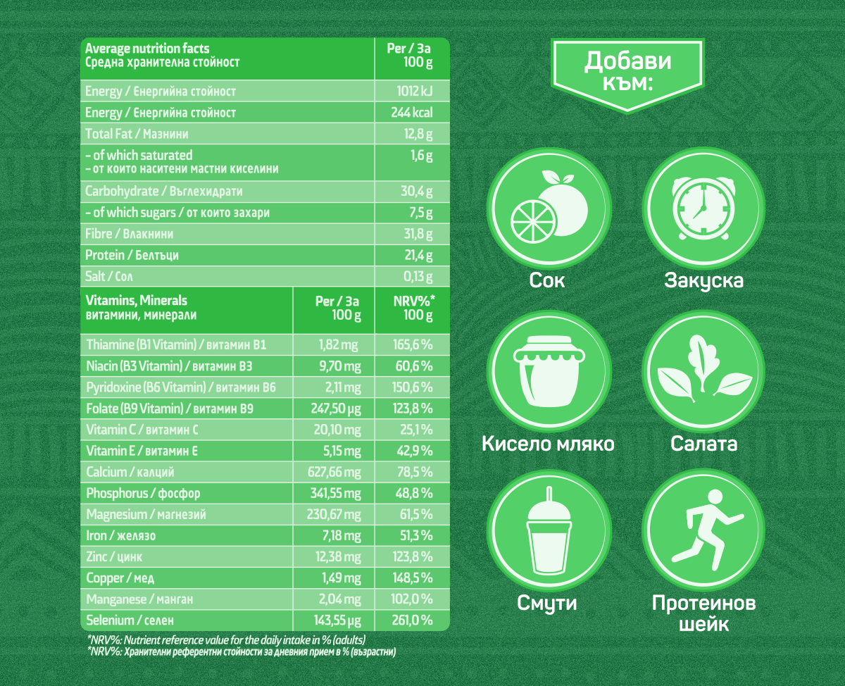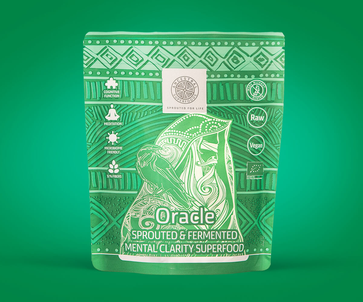 Oracle е покълнала и ферментирала функционална храна на прах за хора, които работят с ума си – подпомага когнитивните функции, концентрацията и справянето със стреса. Състав:ферментирали трици от кафяв ориз на прах*, ферментирали трици от коноп на прах*, покълнали трици от златно просо на прах*, покълнали тиквени семена на прах*, покълнали трици от златно ленено семе на прах*, покълнало златно лененено семе на прах*, сушени плодове на прах*: (ябълка, шипка, земна ябълка и арония), коприва на прах*, натурален аромат на лимон, пробиотичен комплекс* (Lactobacillus gasseri, Lactobacillus acidophilus, Lactobacillus casei sp. rhamnosus, Bifidobacterium bifidum, Bifidobacterium infantis, Bifidobacterium longum, Bifidobacterium breve, Bifidobacterium adolescentis, Streptococcus thermophilus), деактивирана хранителна мая* *от биологично земеделие