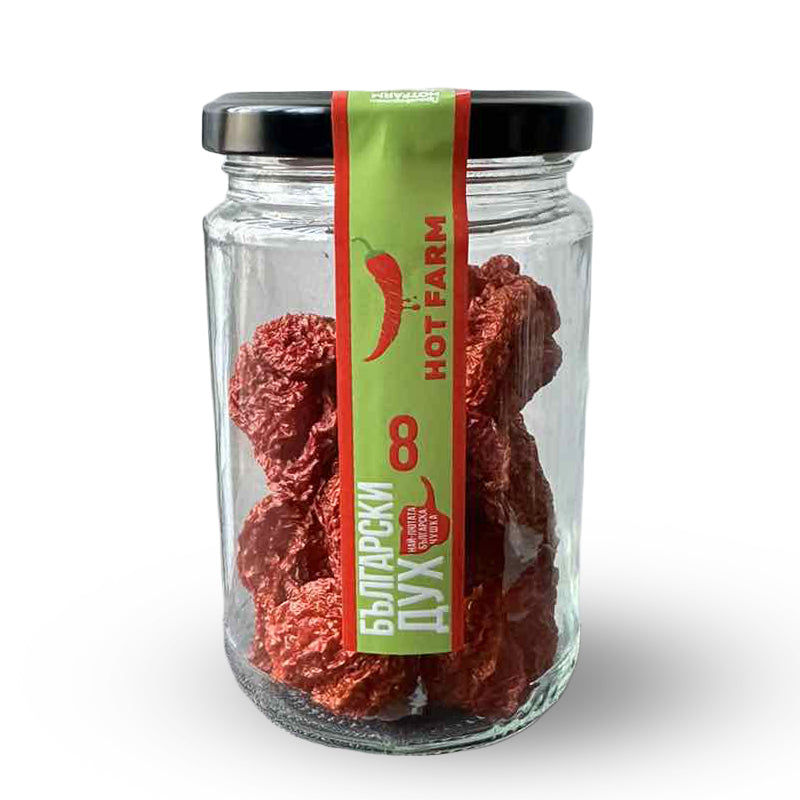 Открийте силата на българския дух със сухите цели люти чушки от сорта „Български дух"" – изключителен сорт, който постави България на световната люта сцена. Съчетава автентичния вкус на българската традиция и силната лютивина. Сушени с грижа и внимание, тези чушки запазват всичките си полезни свойства и наситения си аромат.